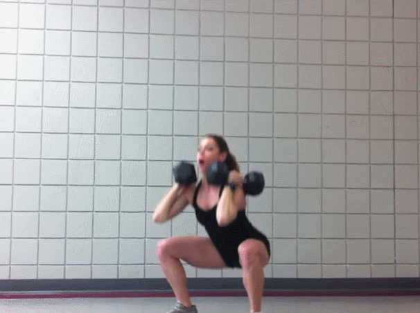 Primero debes realizar una sentadilla completa mientras sujetas las pesas a la altura de tus hombros. Cuando subas en la sentadilla, intenta levantar las pesas hacia arriba. Baja el peso y acompáñalo con tu cadera, es decir, haz una sentadilla y repite.