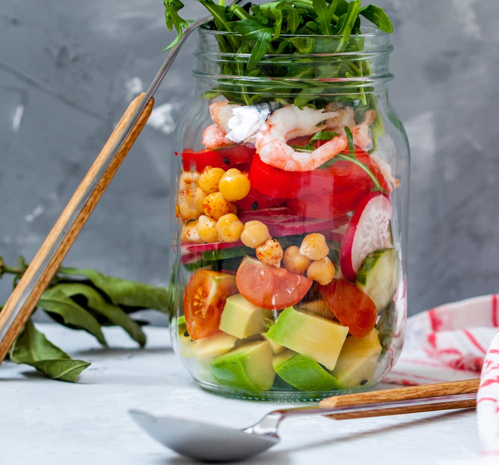 Lo único que necesitas para lograr esta ensalada súper pro es colocar en tu Mason Jar un pepino picado, jitomatitos cherry, cebolla, un huevo cocido en trozos, aguacate, camarones cocidos, lechuga romana. Condimenta con sal y pimienta al gusto.