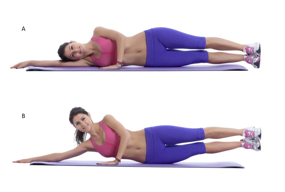 Las elevaciones laterales se realizan con un brazo extendido, mientras el otro se encuentra apoyado sobre el piso.