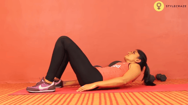 Recostada en el piso, mantente boca arriba con las plantas de los pies apoyadas en el piso y extiende tus brazos e intenta tocar talones de forma lateral. Realiza 20 repeticiones de cada lado en 4 series.