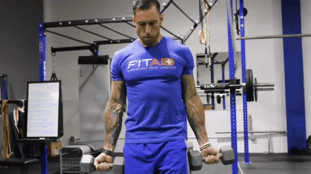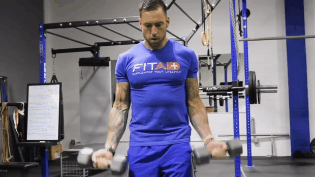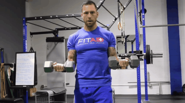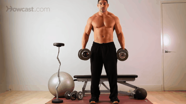 De pie, toma unas mancuernas a los costados del cuerpo, ahora elévalas al mismo tiempo a la altura del hombro y bajo lentamente, no despegues los codos del cuerpo. Realiza 4 series de 12 repeticiones en circuito.