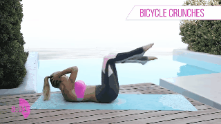 Para estas abdominales tienes que levantar las piernas y alternarlas con el objetivo de que tus codos toquen la rodilla opuesta, debe parecer como si pedalearas una bicicleta.