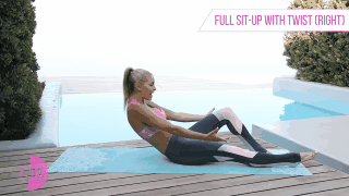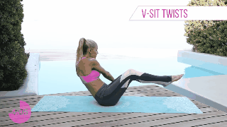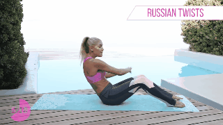 Siéntate en el tapete, levanta tu espalda y piernas, puedes doblarlas si quieres. Gira tu torso a la izquierda y derecha con el objetivo de tocar el piso con tus manos, no bajes las piernas mientras haces esta serie.