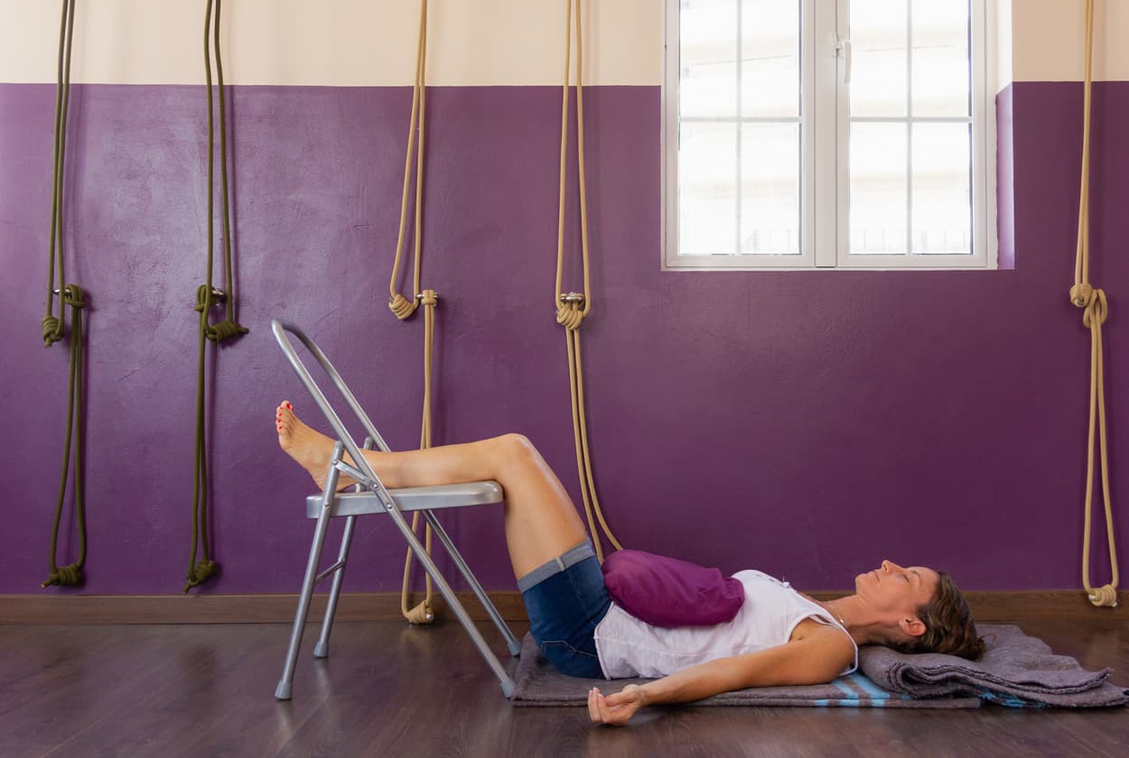 Recuéstate en el suelo y coloca la silla frente a tus piernas. Sube los pies al asiento y, en esa postura, sube la cadera para formar una escuadra. Baja sin permitir que tus glúteos toquen el piso y repite.