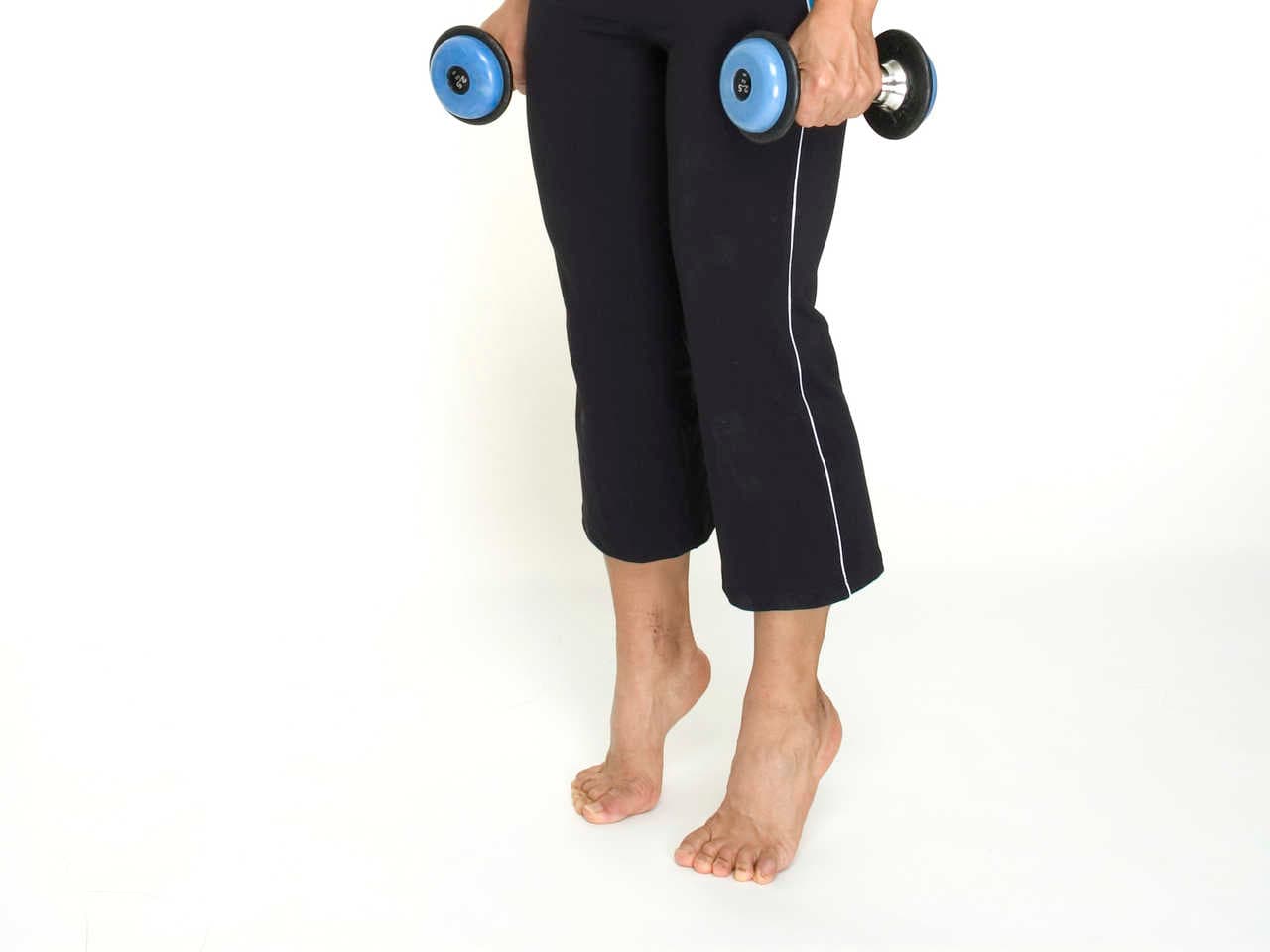 Párate al respaldo de una silla. Sostén el respaldo de la silla con tus manos y abre tus pies a la altura de la cadera. Ahora eleva tus talones hasta que puedas sostenerte en puntitas durante unos segundos y luego descansa sobre los talones, manteniendo los pies planos sobre el suelo.