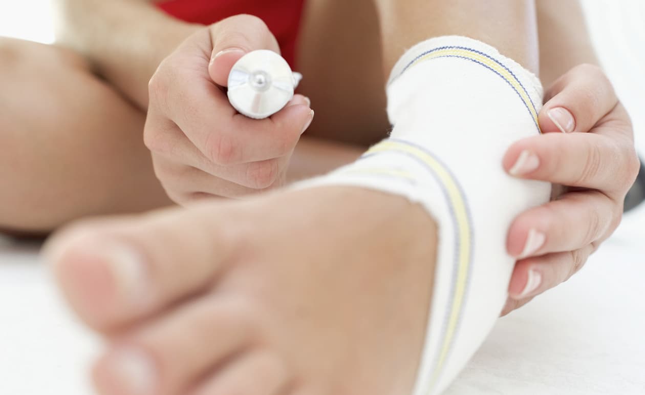 Para un esguince de grado uno necesitamos reposo, hielo, compresión y elevación. Es decir, hielo durante veinte minutos hasta cuatro veces al día —es importante no colocarlo más tiempo para evitar quemaduras—, no apoyar el tobillo cuando caminamos y mantenerlo elevado, y utilizar vendajes de compresión.