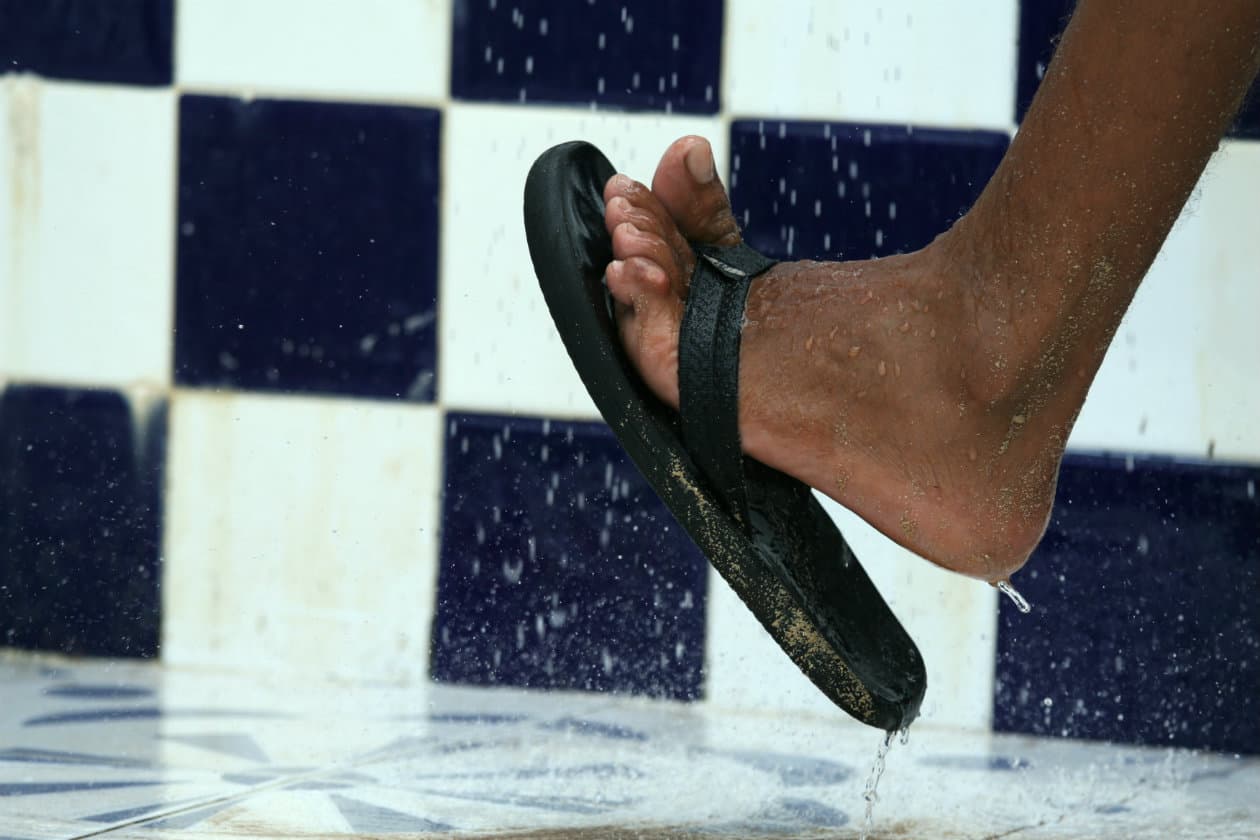 Especialmente en la zona de duchas y vestuarios, usa siempre calzado tipo ojotas o sandalias y nunca andes descalzo. Los suelos húmedos y tibios son un espacio en el que los gérmenes se reproducen y además es fácil contagiarse pie de atleta.