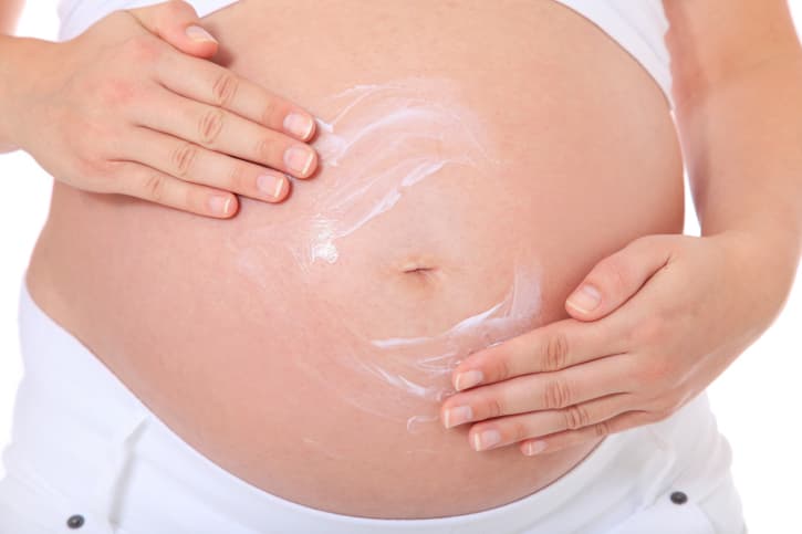 Especialmente durante el embarazo es importante aplicar diariamente y varias veces por día una crema humectante para la piel y evitar que la combinación de resequedad y estiramiento de la piel genere estrías. Elige alguna que contenga vitaminas A y E y aplícala en pechos, abdomen, glúteos, muslos y brazos. También es muy beneficioso masajear la piel diariamente con un guante para masajes o con una esponja vegetal, para aumentar la circulación en la zona propensa a estrías.