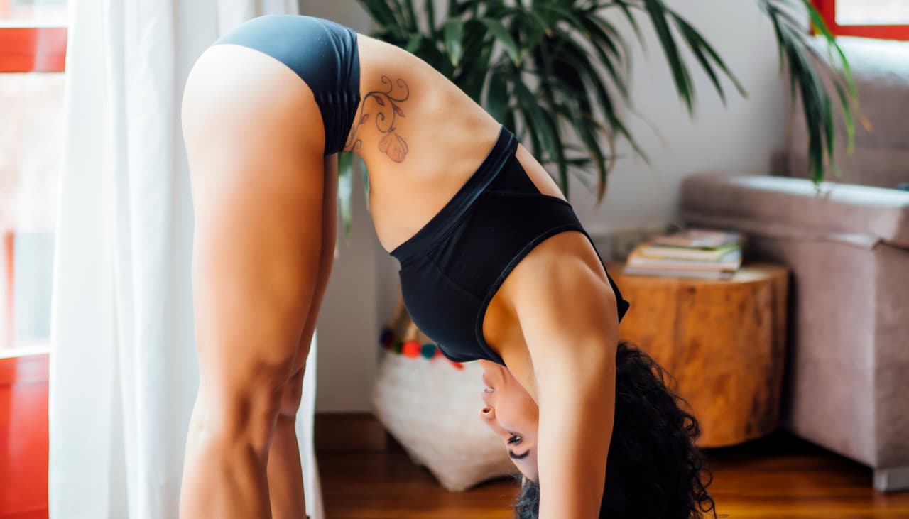 Por último, descansa un minuto y ponte de pie. A continuación flexiona tu cadera para que intentes tocar tus pies, pero sin flexionar las rodillas.