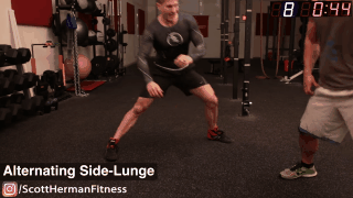 Da un paso hacia adelante y baja la rodilla trasera para que casi toque el suelo. Alterna las piernas por 45 segundos.
