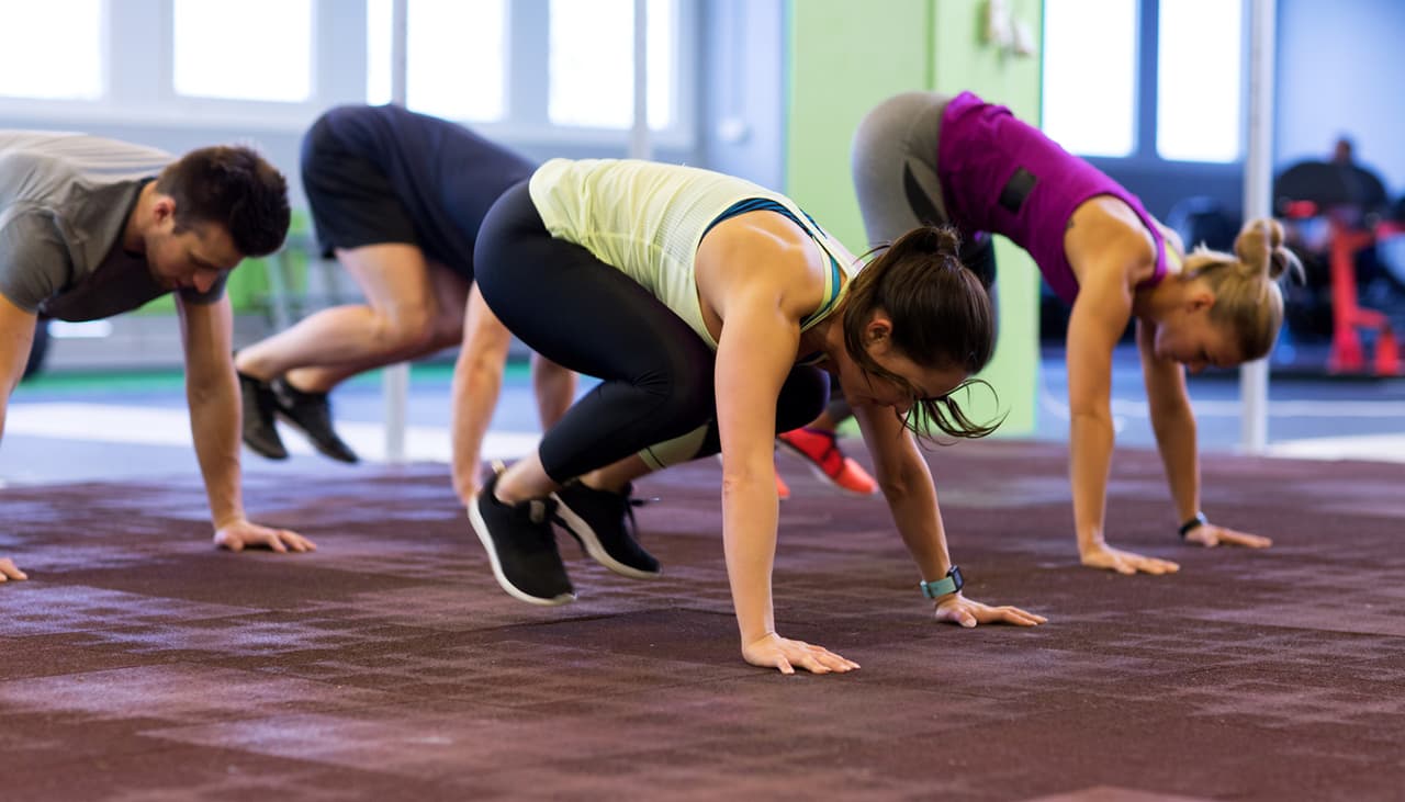 Desde la postura de pie, con las piernas separadas, lleva las palmas de las manos al piso y salta hacia atrás para quedar en la postura de la plancha. Salta nuevamente hacia adelante, para erguirte. Luego lleva, de un salto, las rodillas hacia arriba, a que se encuentren con las palmas de tus manos, que no podrán estar por debajo de la línea de la cadera. Hazlo 10 veces.