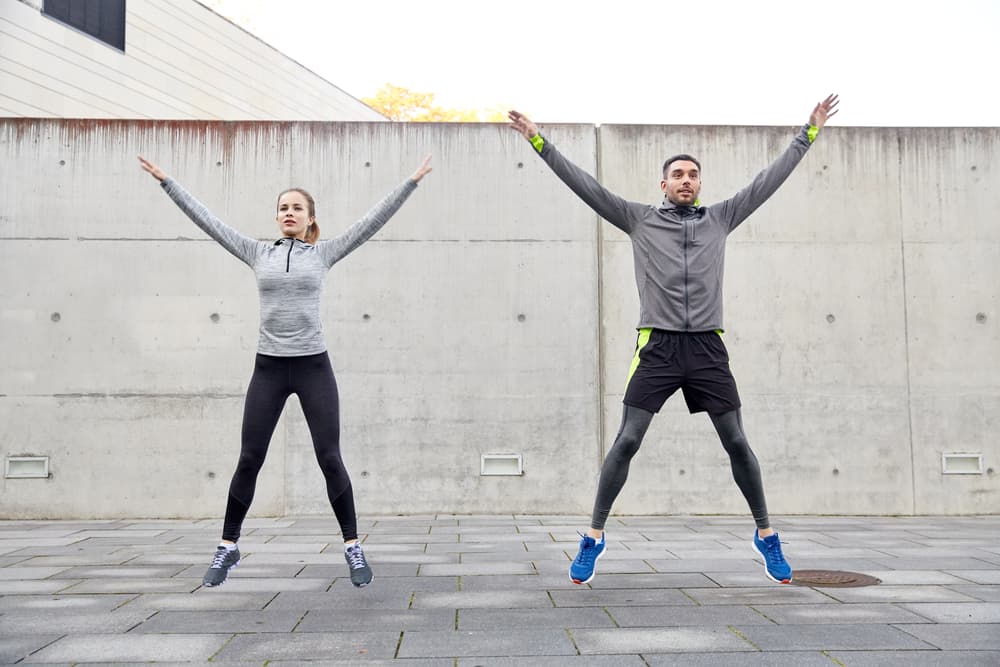 Comienza de pie con los pies juntos y los brazos a los costados del cuerpo. Al saltar, separa las piernas y lleva los brazos hacia arriba. Debes caer en esta posición y saltar de nuevo hacia la posición inicial. Eso es una repetición.