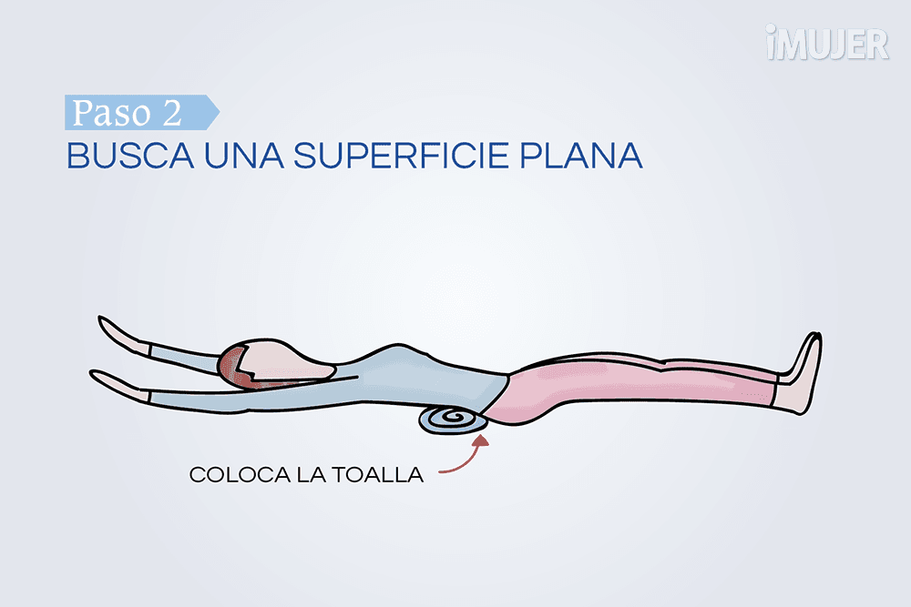 Busca una superficie plana donde puedas realizar el ejercicio, como el piso. Siéntate en él, luego coloca la toalla debajo de tu espalda en la zona lumbar y acuéstate sobre ella. Recuerda que la toalla debe ser un poco más grande que tu cuerpo.