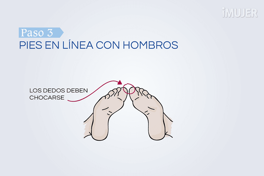 Tus pies deben estar separados y quedar en la misma línea que tus hombros. Además, tienen que estar inclinados hacia adentro de manera que los dedos se "choquen".