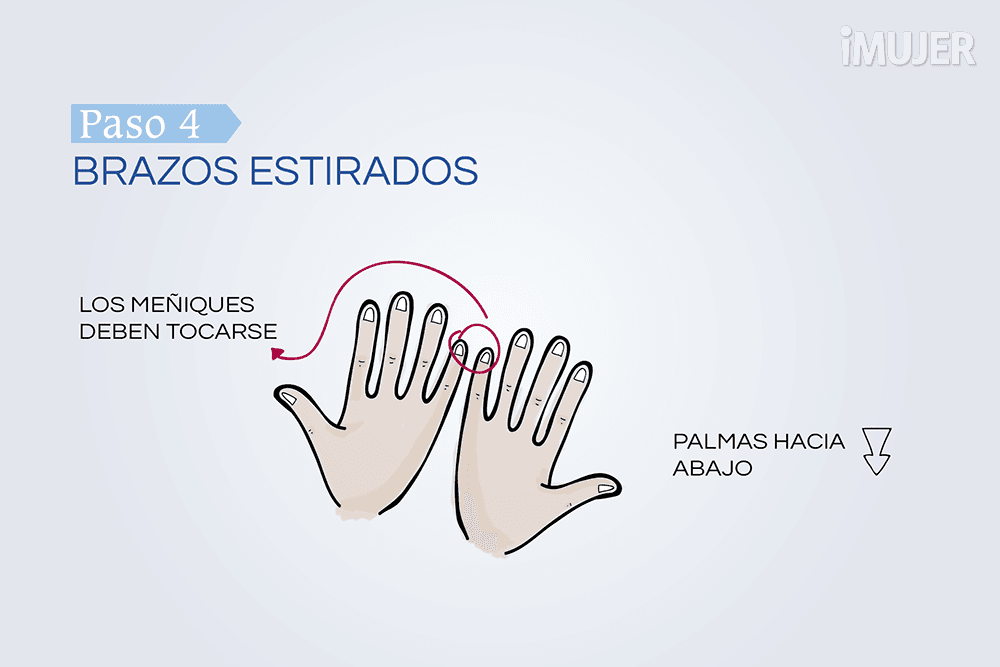 Pon tus brazos por encima de la cabeza estirados, con las palmas de las manos hacia abajo, de forma que los meñiques se toquen. Realiza el ejercicio durante 5 minutos 3 veces al día.