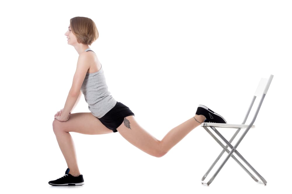 Ponte de pie y coloca una silla detrás de ti. Estira la pierna derecha y apoya el empeine sobre el asiento.
