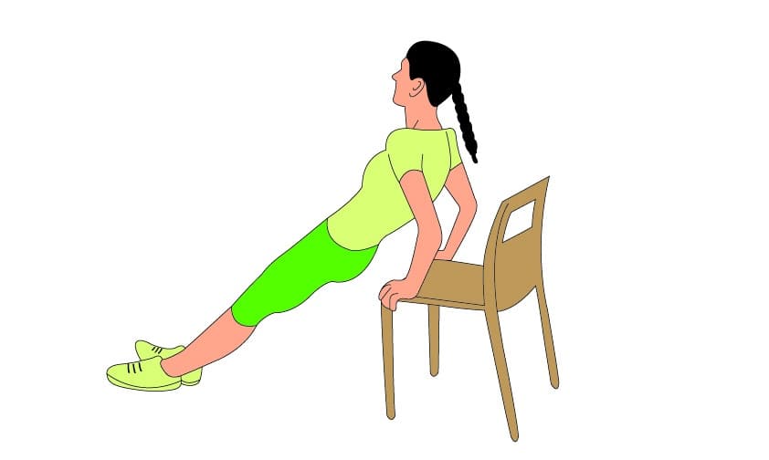 Colócate en la posición que ves en la imagen: de espaldas a la silla, con las manos apoyadas sobre el asiento, los codos ligeramente doblados, las piernas extendidas y la pelvis apuntando hacia arriba. Contrae los abdominales, extiende los codos y mantén la posición por unos segundos. Vuelve a repetir este movimiento 20 veces.