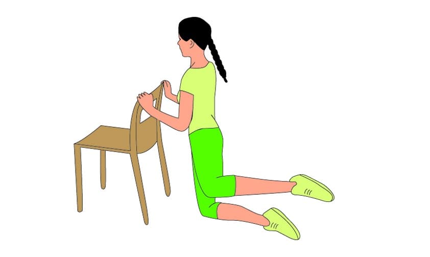 Arrodíllate detrás de la silla y apoya las manos sobre el respaldo. Contrayendo los abdominales y haciendo fuerza con los glúteos, empuja una pierna hacia atrás y mantenla en el aire a unos 15 cm del suelo. Bájala despacio y vuelve a empujarla hacia atrás nuevamente. Repite el ejercicio unas 20 veces y luego haz lo mismo con la otra pierna.