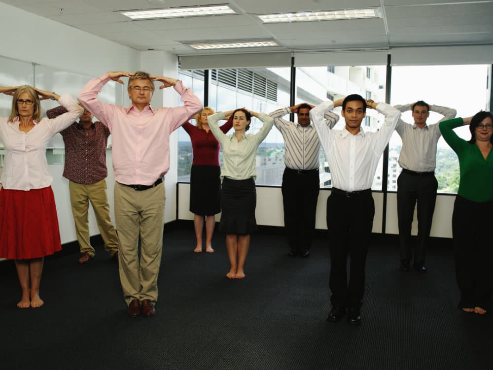 Usualmente existe un guía que puede indicar ejercicios tan fáciles como ponerse de pie con una pierna estirada, tratando de patear las nalgas con el talón de la otra. La reunión puede hasta distensionar los ánimos en la oficia y luego de los 15 minutos todos estarán con la energía activada para seguir sus tareas.