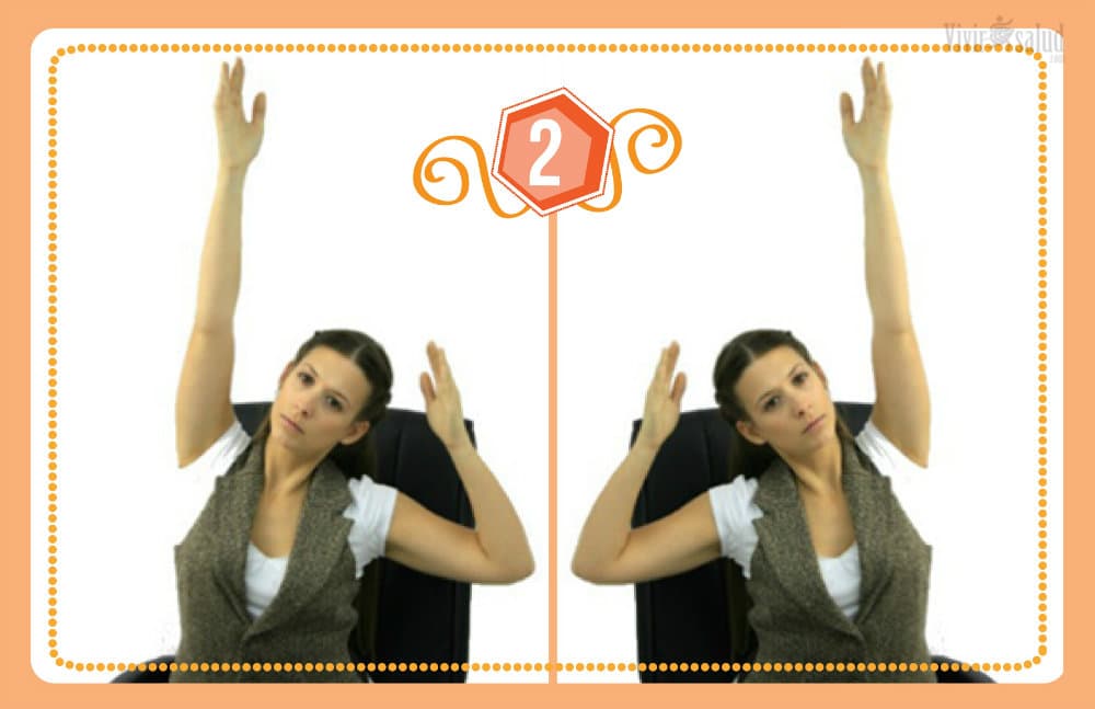 Mientras estás sentado en tu silla, estira un brazo hacia atrás a la altura de los hombros. Relaja la cabeza y siente como tu circulación mejora y te activa de nuevo. Sostén el movimiento durante 30 segundos, luego cambia de brazo. Realíza este ejercicio 3 veces al día.