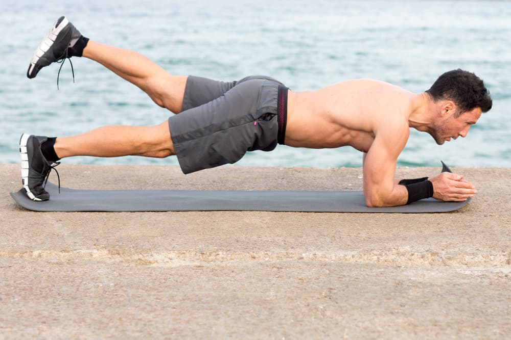 Realiza la posición de la plancha con los codos apoyados y levanta una pierna, siempre tratando de mantener a los hombros y la cadera en una la línea recta (en la siguiente repetición, cambiar de pierna).