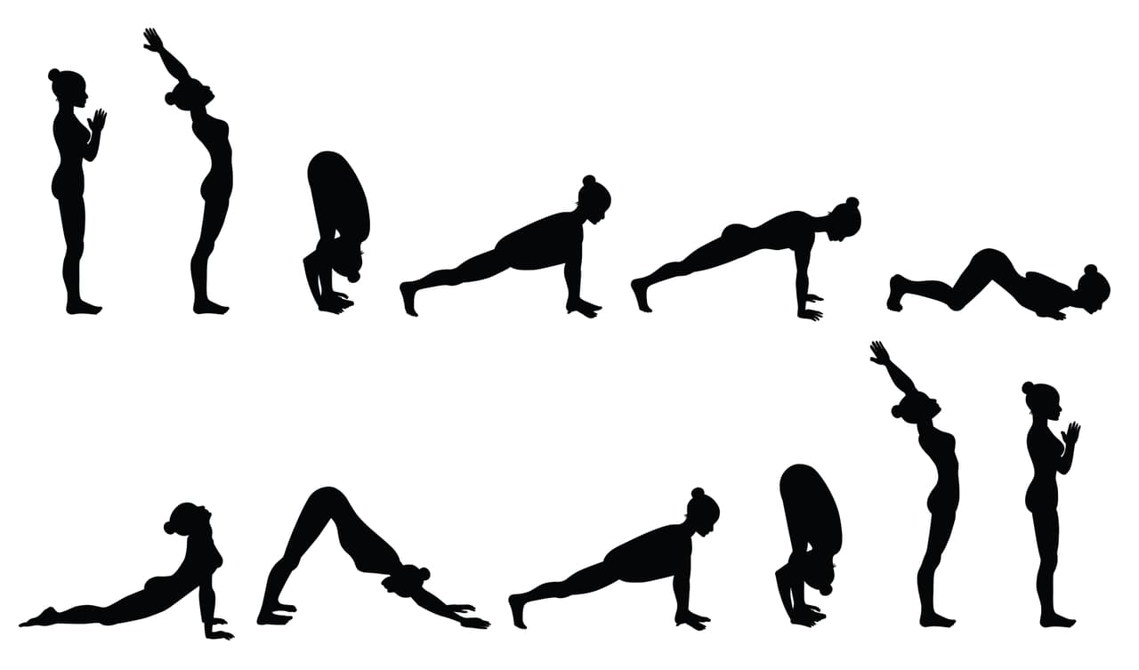 - Comienza desde la postura de pie, con espalda derecha, a realizar la serie de asanas que componen el saludo al sol, inhalando para ir a la primera postura, exhalando para ir a la segunda, y así.