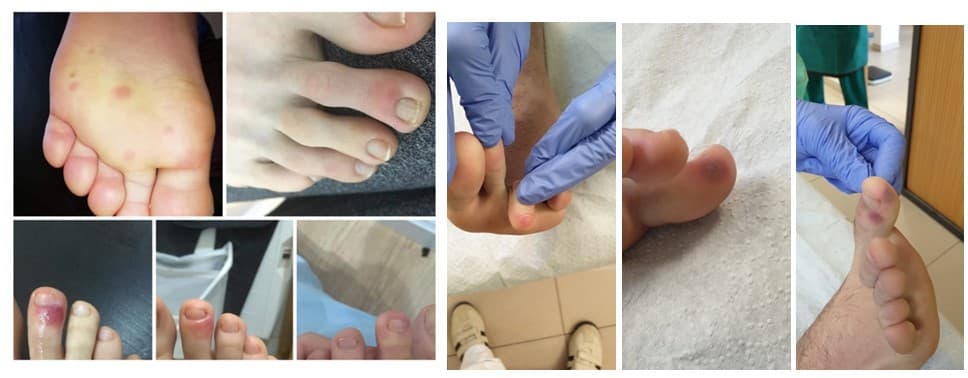 Los especialistas de esta institución se percataron de que varias personas enfermas de coronavirus desarrollaron eritemas, es decir, lesiones de color púrpura o rojizas, muy similares a las de la varicela o el sarampión en torno a los dedos de los pies, las cuales se curan sin dejar marcas.