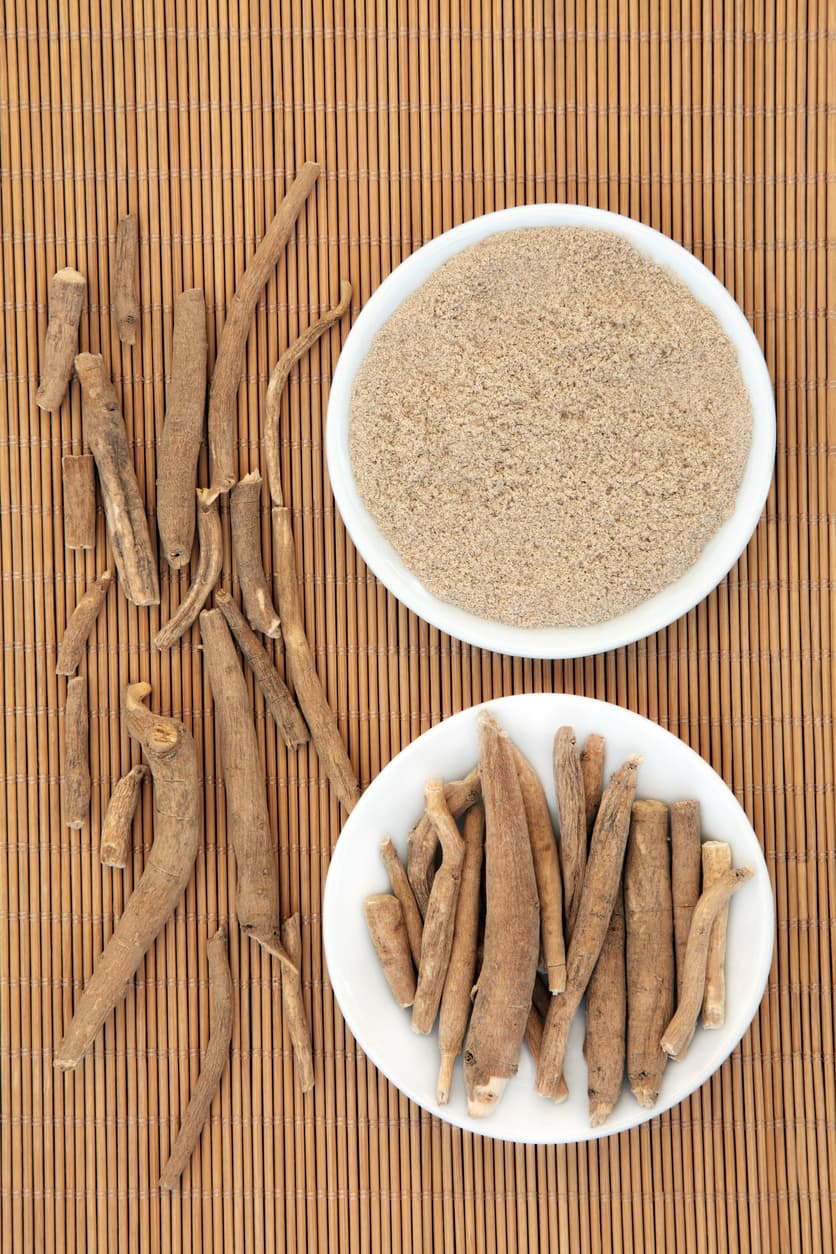 Ashwagandha: raíz que aumenta la resistencia a los factores de estrés ambientales, alivia el dolor, es antioxidantes, reduce la inflamación, estimula la función tiroidea, ayuda a regular el estrés, modula los niveles de cortisol y también estimula la función respiratoria e inmunológica.