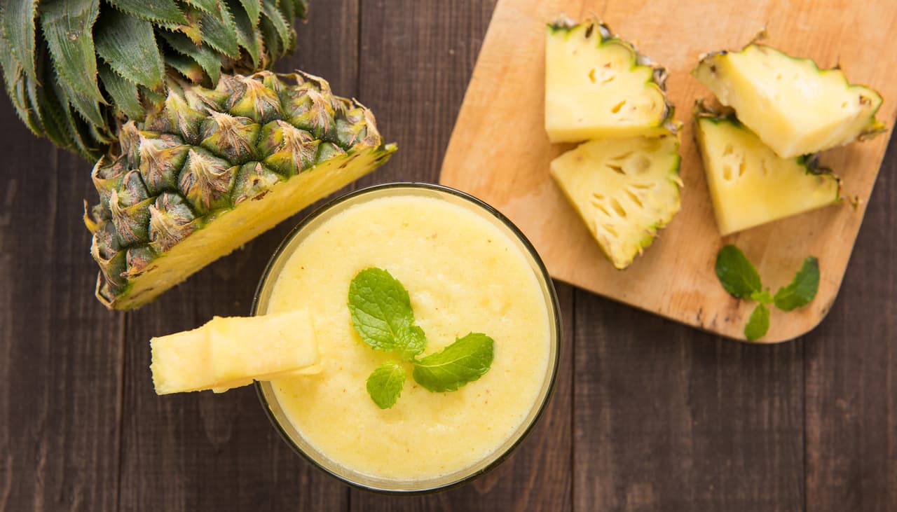 Esta receta de jugo energético es deliciosa y es una bomba contra la fatiga. La piña tiene altas cantidades de fibra y vitamina C, y la menta combate el mal aliento y cuenta con acción restauradora.
