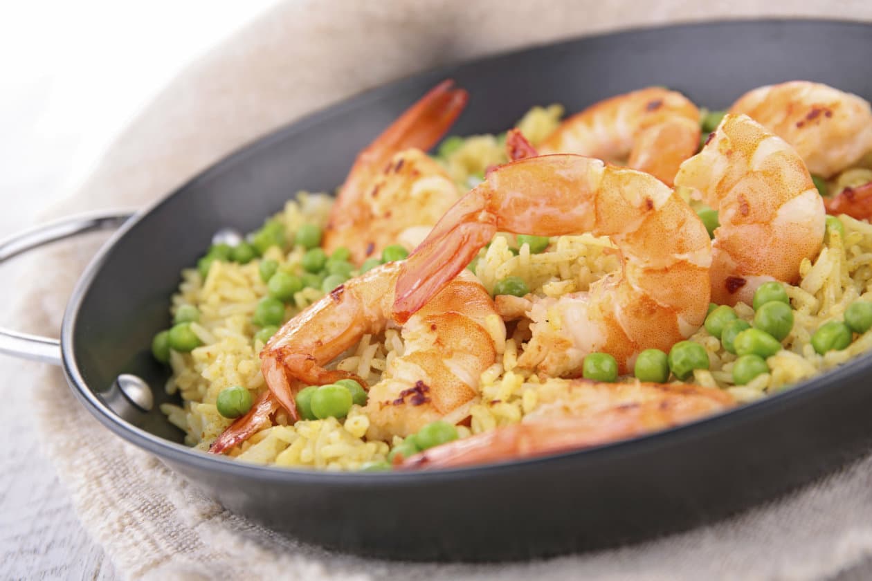 Calienta 1 cucharadita de aceite de oliva en una sartén antiadherente a fuego medio. Añade 6 camarones grandes (pelados y desvenados) y 1 diente de ajo picado; cocina hasta que los camarones queden opacos. Pásalos a un tazón. Combinar 1/4 lata de tomates triturados asados al fuego, sin escurrir; 1/8 de cucharadita de hebras de azafrán, aplastadas; y 1/8 de cucharadita de salsa picante en la sartén. Añade 1/4 taza de arroz integral cocido, y 1/4 lata de garbanzos cocidos; cocina a fuego lento 5 minutos. Añade la mezcla de camarones y cocina hasta que esté caliente.