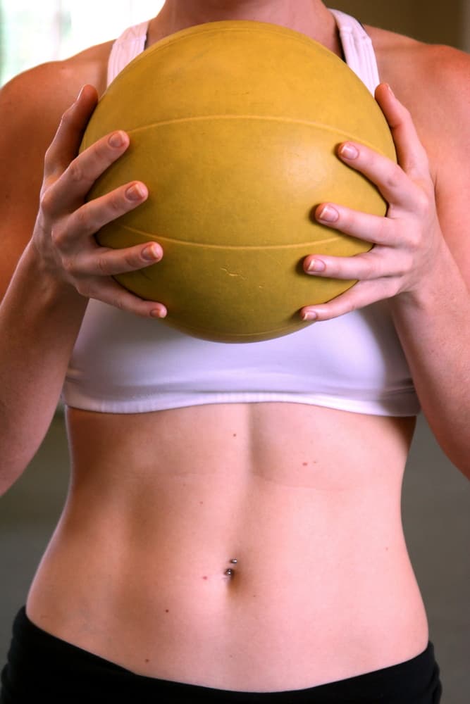 - Comienza de cara a una pared (con un poco de distancia), con los pies separados, sosteniendo una pelota medicinal contra el pecho.