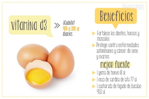 La vitamina D3 fortalece los dientes, los huesos y los músculos. Como si esto fuera poco, es una gran aliada en la prevención de enfermedades autoinmunes, el cáncer de mama y de ovarios. Es aconsejable ingerir entre 400 y 800 unidades internacionales por día. Para que tengas una idea, una yema de huevo contiene 18 unidades internacionales; una onza de sardina, 77; y una cucharada de hígado de bacalao, 453.
