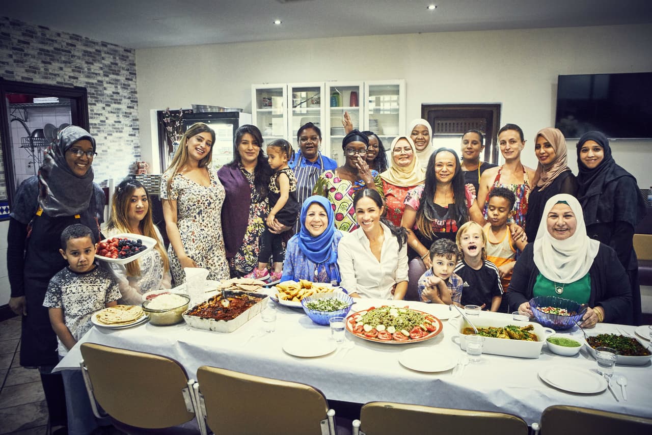 «The Hubb Community Kitchen es un lugar para que las mujeres se rían, lloren y cocinen juntas. [...] La duquesa de Sussex está apoyando un nuevo libro de cocina de caridad, que celebra el poder de la cocina para unir a las personas».