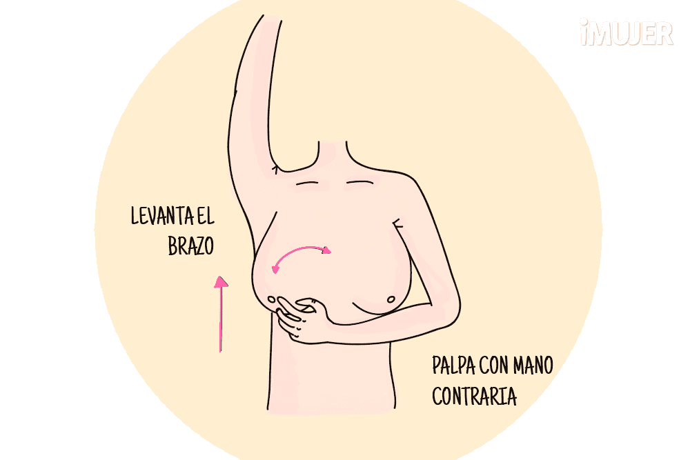 Levanta un brazo y palpa con tu mano contraria el área mamaria, busca diferencias, posibles bultos o dolor. Luego repite con el otro brazo.