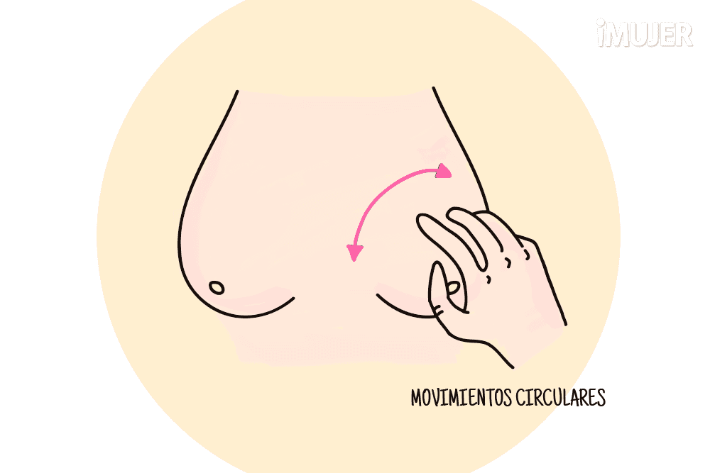 Con las yemas de los dedos de tu mano izquierda, haz movimientos en forma de círculo para palpar toda el área. Aplica diferentes presiones para sentir todo el tejido.