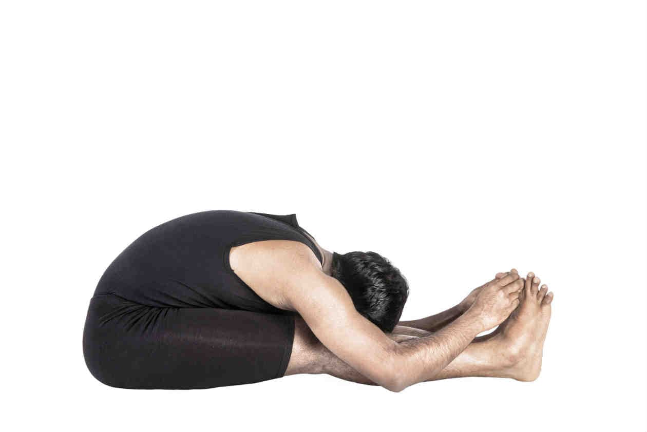 Sentados con las piernas estiradas, llevar los brazos por encima de la cabeza. Inhalar y dejar acercar el pecho hacia las piernas, tocar con las manos los pies. En cada inhalación intentar extender más la columna, y al exhalar liberarla un poco. No hay que redondear la espalda.