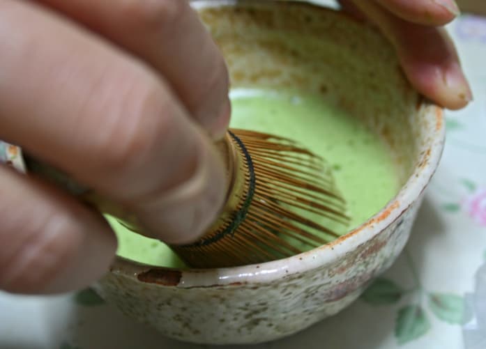 Agrega agua tibia o caliente (no hirviendo) y revuelve para conseguir una consistencia uniforme, algo espesa. El modo tradicional de tomar té matcha no lleva azúcar ni leche.