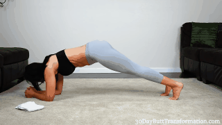 Haz una plancha apoyándote en los codos y luego lleva tus rodillas hacia los brazos. Mantén tu cadera cerca del suelo. Hazlo por un minuto.