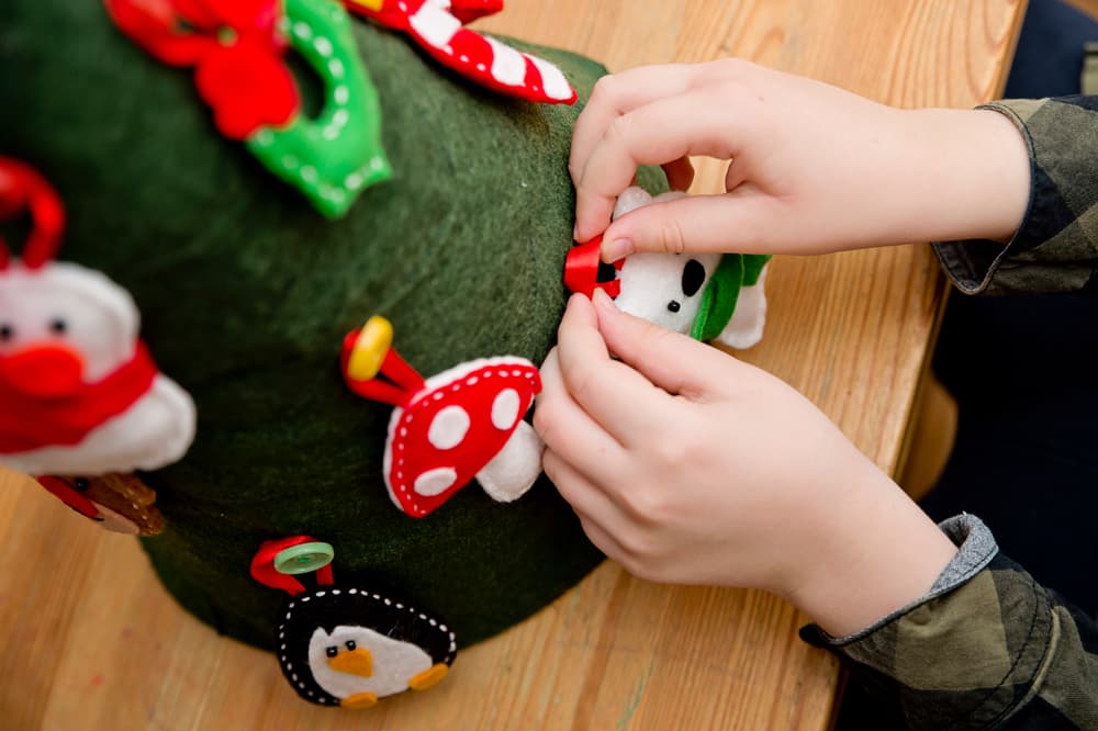 El fieltro es un material fácil de adquirir, económico y muy versátil, además de que lo puedes encontrar en muchos colores. Lo único que tienes que hacer es decidir si quieres poner el fieltro sobre la pared o rellenar la figura de tu arbolito para darle dimensión.