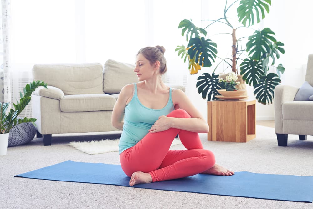 - Usa el codo izquierdo para hacer tracción en la rodilla derecha y girar todo tu cuerpo a la derecha, con el brazo derecho extendido hacia atrás.