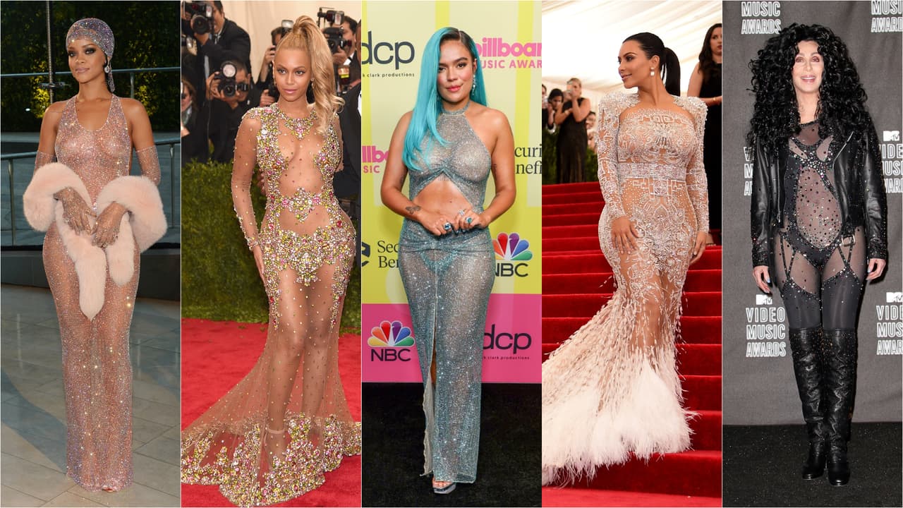 La tendencia del sheer dress no es nueva, hay casos clásicos como Marilyn en 1962 cuando le cantó happy birthday al Presidente o o el impacto brutal que causó Rihanna en 2014 y obvio, la reina y la única Cher con su gran nude dress en 1974 en la MET Gala.