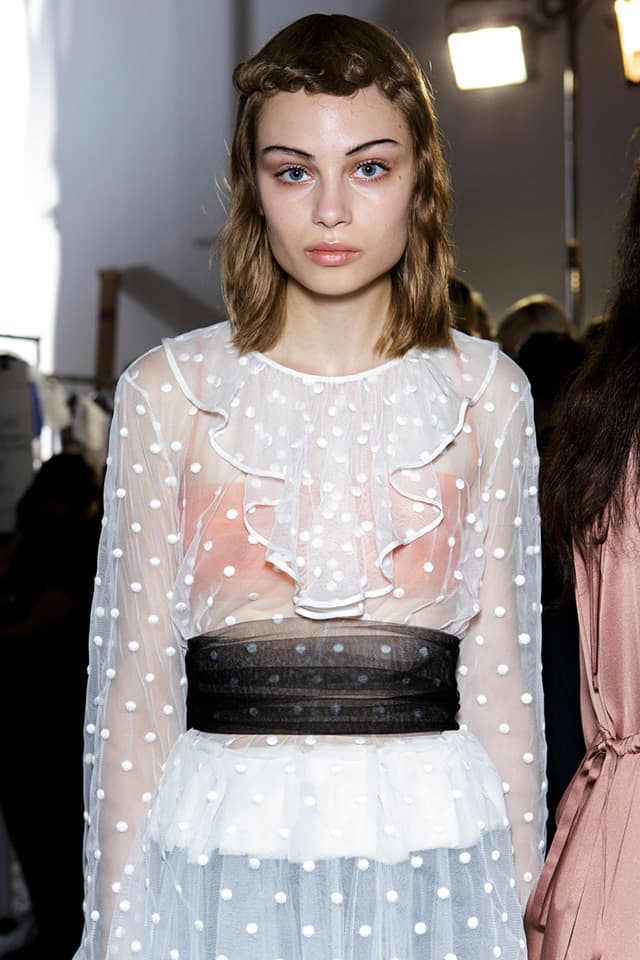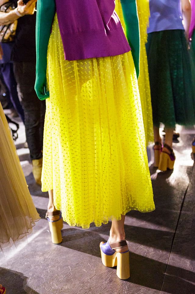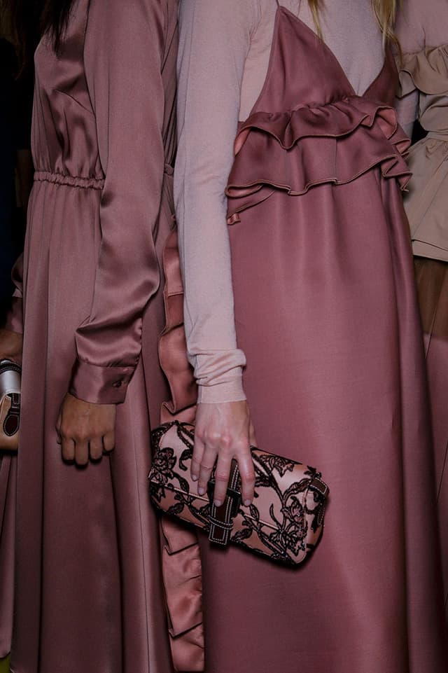 Tonos como el rosa lograron hacer un inesperado contraste con otros colores como el verde esmeralda. Después vino una sección de colores más neutros como el beige, el cual daba vida a piezas como suéteres, faldas a la cintura y ciertos vestidos en forma de jersey. Para concluir el show, Rochas presentó una serie de vestidos hechos a base de telas de presencia más interesante, con estampados y bordados detallados.