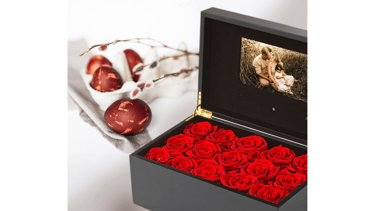 preservadas dentro de una caja de madera que incluye una pantalla HD y que reproduce videos personalizados con música, permitiendo a nuestros clientes enviar un mensaje único y emotivo a sus seres queridos.