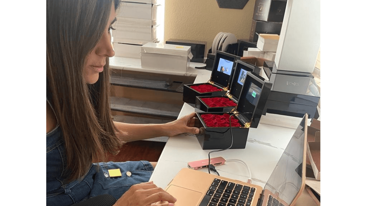 Andrea: Nuestros clientes pueden personalizar la selección de rosas, así como el contenido del video que se reproduce en la pantalla HD. Pueden elegir entre nuestras opciones predeterminadas de templates e incluso agregar su propia música, lo que hace que cada Verona Roses sea verdaderamente único y especial.