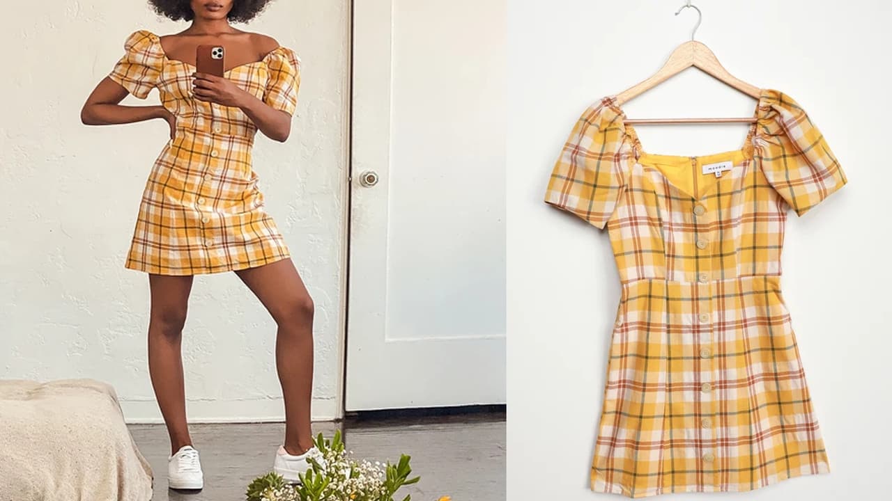 Otra forma de actualizar los 90 viene con esta prenda: sí, es un minivestido, pero sus mangas abultadas, su corte recto y su diseño a cuadros, con botones frontales en línea, suman la comodidad noventera con el buen gusto de 2021. Combínalo con tus Converse favoritos.