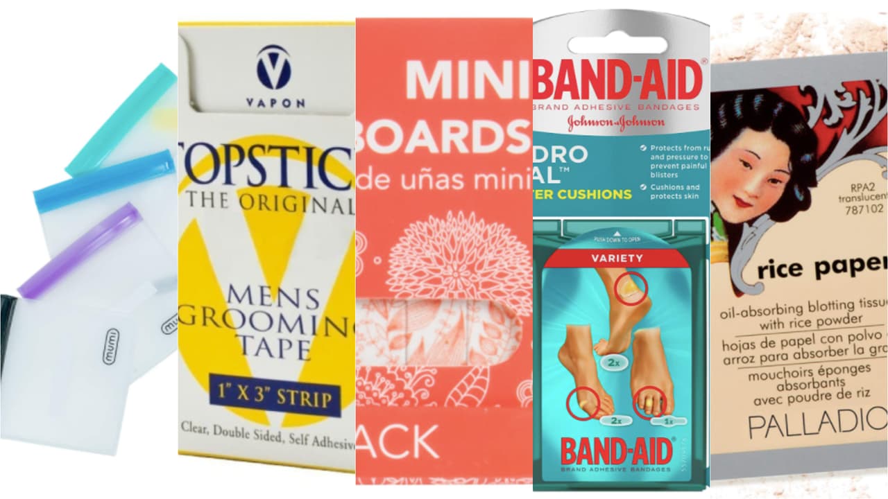 La bolsita de maquillaje debe ser súper compacta, es sólo para lo básico, es lo que usas en tu bolso de noche también, así que olvídate de meter la paleta de 50 sombras y el pegamento de pestañas.