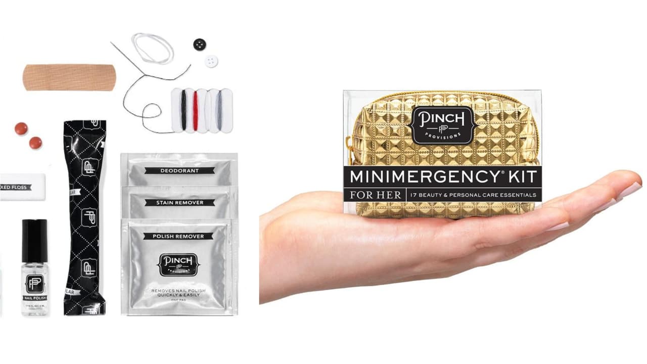 - Miniemergency kit de Pinch Provisions en empaque de estoperoles dorados. Incluye 17 objetos de belleza, cuidado personal y moda. Precio: $19