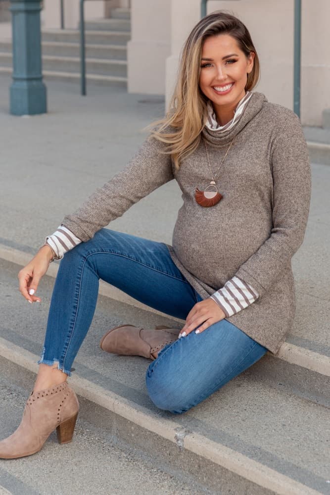 Si lo tuyo no son los vestidos, puedes lucir un look casual y sofisticado con jeans y un bello suéter. Lo mejor de los jeans es que son súper versátiles y quedan con muchas prendas superiores. Te recomendamos que busques blusas o suéteres ligeramente largos que cubran toda tu pancita y tengan una bella caída después de ello.
