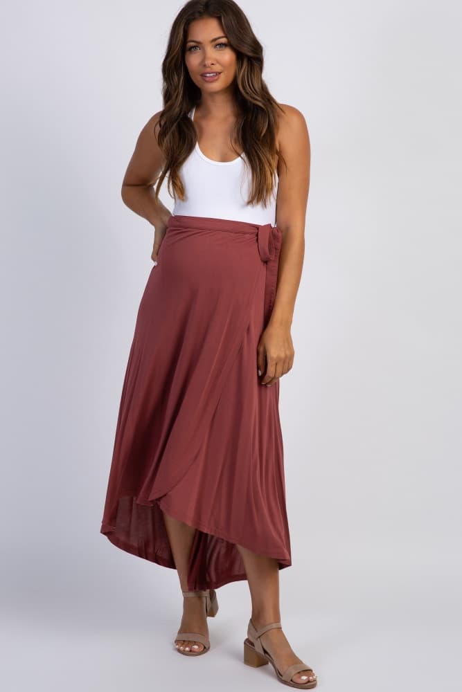 Existen muy bellos modelos de faldas tipo pareo que se ajustan perfecto a la circunferencia de tu pancita. Te recomendamos escoger una blusa de un color básico como el blanco que pueda combinarse fácilmente con el color de la falda que más te guste. Las sandalias nude con un tacón pequeño son ideales para combinar con este look.