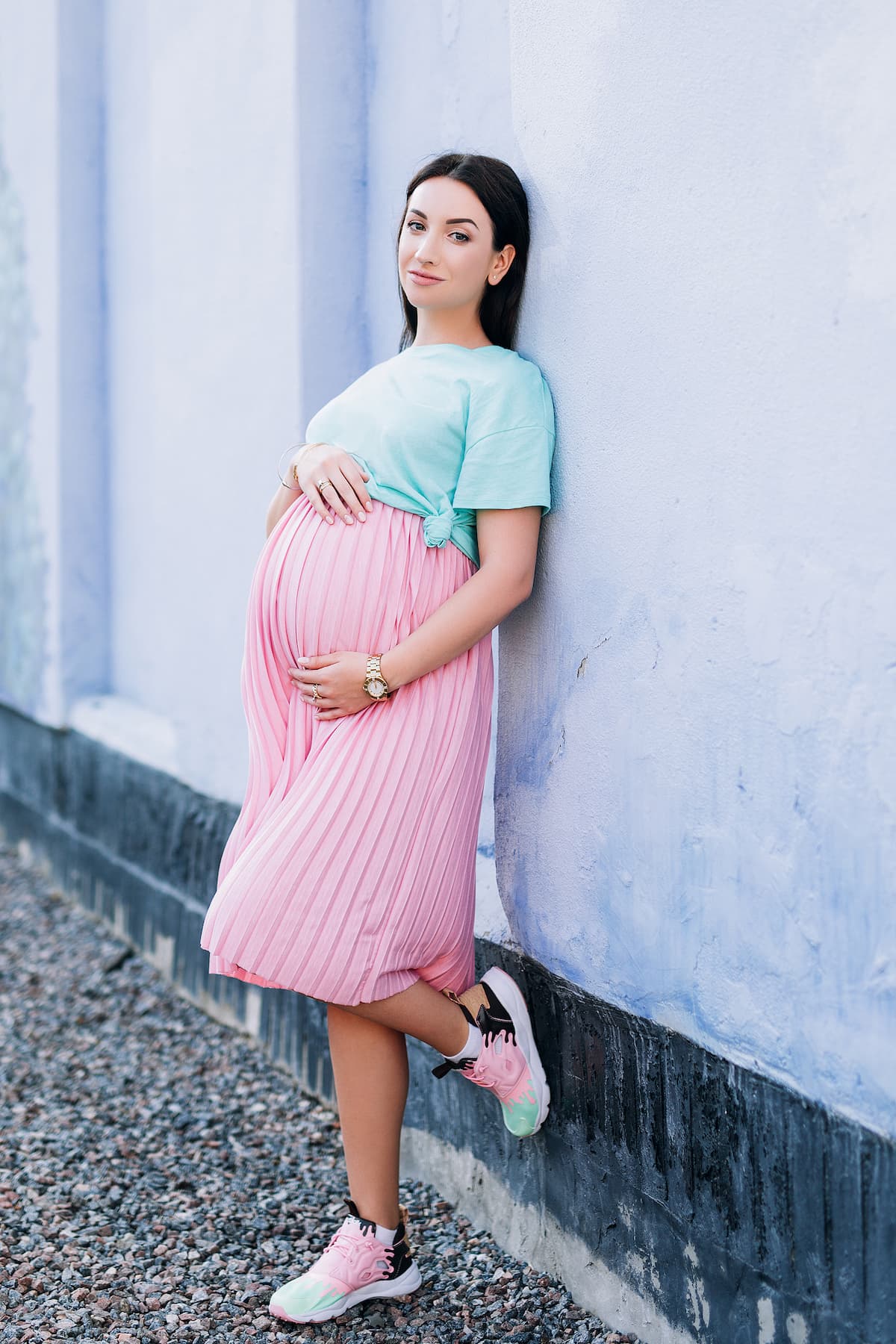 Las faldas largas y plisadas también resultan muy cómodas durante la gestación. Acompáñalas con una camiseta de color y tus tenis favoritos, y tendrás un atuendo increíble.